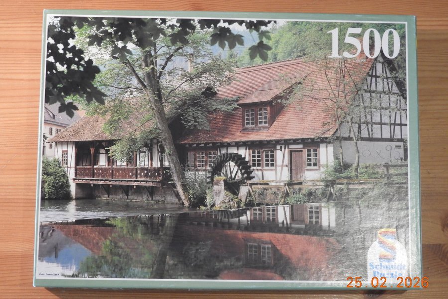 Schmidt Puzzle med 1500 bitar. Pusslet har ett motiv av ett hus vid vatten med ett vattenhjul. Måtten på det färdiga pusslet är 83x58 cm.