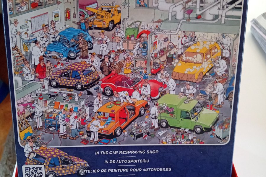 Pussel med 500 bitar. Motivet är en bilverkstad med bilar och mekaniker. Text på framsidan: "IN THE CAR RESPRAYING SHOP", "IN DE AUTOSPUITERIJ", "ATELIER DE PEINTURE POUR AUTOMOBILES", "IN DER AUTOLACKIEREREI".