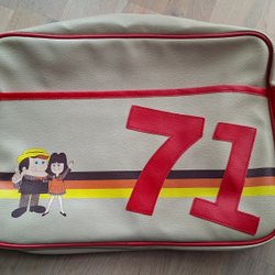 Vintage väska, Abu Garcia fiskeväska i canvas med bruna detaljer. Väskan har en axelrem och stängs med spännen. Den har en flik med tryckknappar och ett rymligt huvudfack. Väskan har slitage och fläckar.