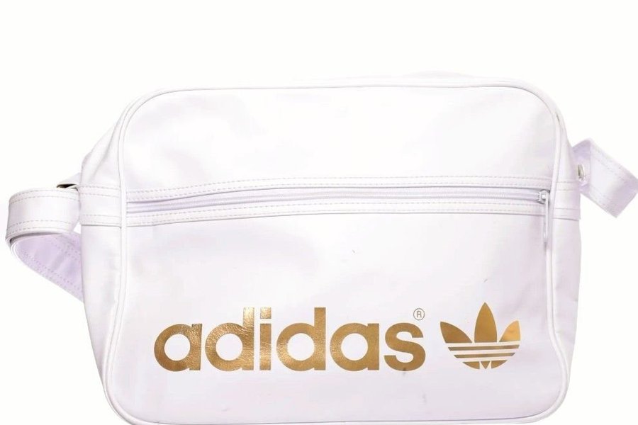 Vit Adidas väska med guldfärgad logga framtill. Väskan har ett justerbart axelband och ett fack med dragkedja.