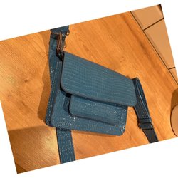 Elegant beige väska med krokodilmönster. Väskan har en justerbar axelrem och en praktisk design med flera fack.