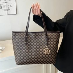 Brun handväska med ett distinkt mönster av sammanlänkade cirklar. Väskan har bruna handtag och en rymlig interiör med dragkedja.