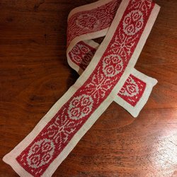 Vävd väska med randigt mönster i grått, rött, vitt och svart.