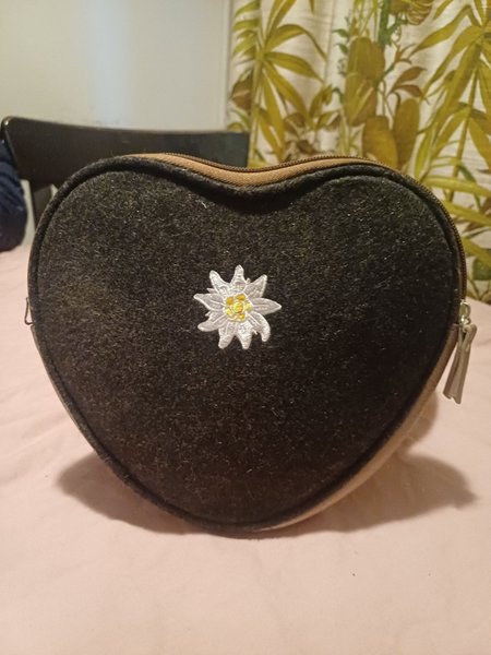 Hjärtformad väska med en broderad blomma på framsidan. Väskan har dragkedja.