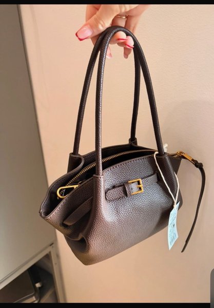 Väska med dragkedja upptill och ett dekorativt spänne framtill. Den har två handtag och en strukturerad yta.