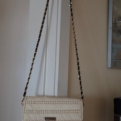 Väskan har en magnetisk stängning och en avtagbar axelrem. Den är handgjord och har en liten "handmade"-etikett på framsidan. Väskan är cirka 15 cm hög och 28 cm bred.
