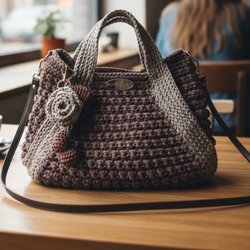 En elegant handväska med en vacker virkad rosdetalj på framsidan. Väskan har ett handtag upptill och en avtagbar guldfärgad kedjerem, vilket gör att den kan bäras både som handväska och axelväska. Den är perfekt för att komplettera en somrig eller festlig outfit.