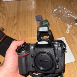 Nikon axelrem, linsskydd, mh-24 batteriladdare för vägguttag, laddsladd, batteri. Monterat tripodfäste och Tripod (benro TSL08A SLIM) manualen finns kvar.