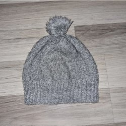 En vit stickad mössa. Mössan har en ribbad struktur och knytband undertill. Den är utformad för att täcka öronen.