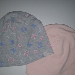 Fyrdelat set med mössor för barn. En mössa är mörkblå med ett jordgubbsliknande mönster (blåbärsmössa). En annan mössa är svart med två pom-poms upptill och knytband. Den tredje mössan är vit med ränder i rött och blått. Den fjärde mössan är röd med ett litet grönt blad upptill. Blandade storlekar men skulle säga att de passar ca 0-8 månader.