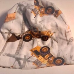 En vit mössa med blommigt mönster i rosa och grönt. Mössan har knytband.