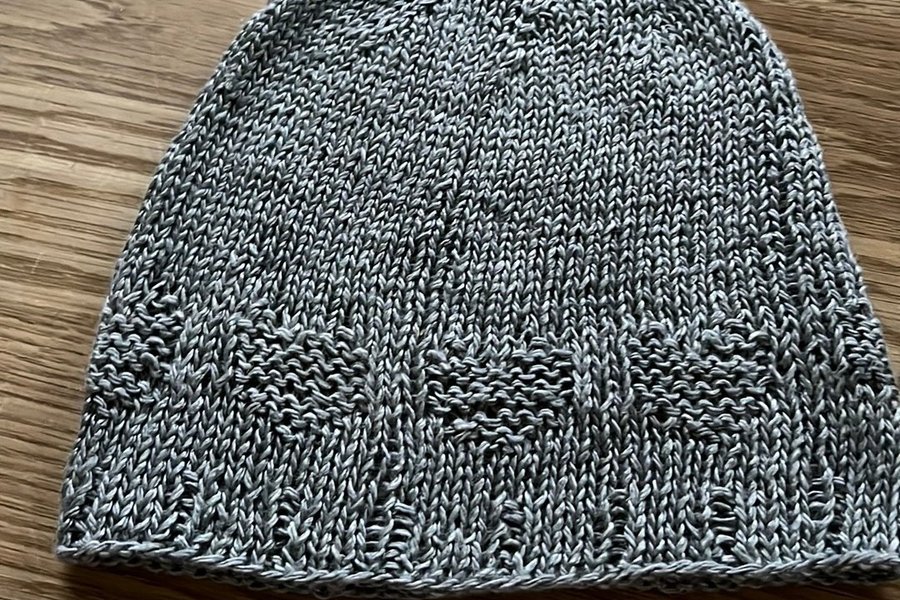 Mössan har ett hjärtmönster runt kanten och slätstickning upptill. Den är formad för att sitta bekvämt på huvudet.