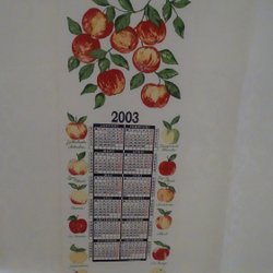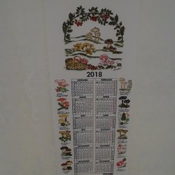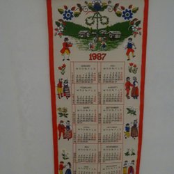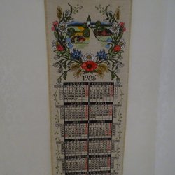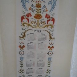 Väggalmanacka i textil med trälister i ovan- och nederkant. Vikt ca 100 g. Mönstret är designat av Inger Åberg.