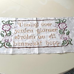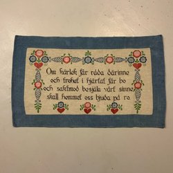 Hanbroderad bonad " Kärlek och tro skänker lycka och ro"