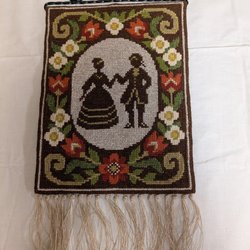 Väggbonad med motiv av ett rött hus i ett landskap. På baksidan står det "Minne från Asta oH sommaren 1990".