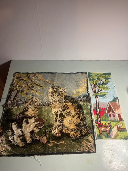 Två fina vintage bonader. Den med katter har lugg lite sammetsliknande känsla.