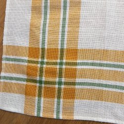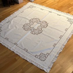 Glansigt ganska kraftigt tyg sytt som två dukar. 60 cm x 60 cm och 60 cm x 38 cm
