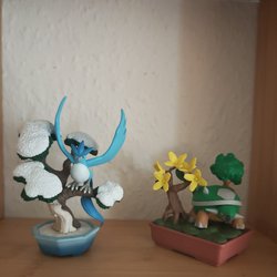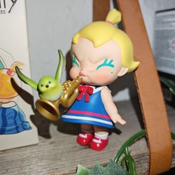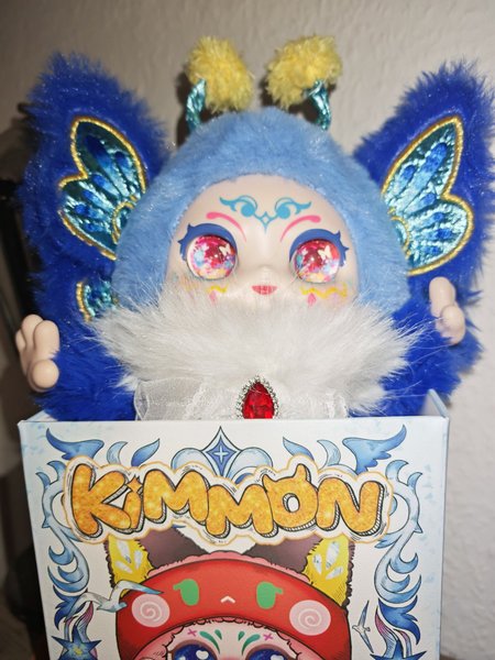Kimmon plysdyr med blå pels og sommerfuglevinger. Plysdyret har store øjne med sommerfuglemotiver og en hvid, pjusket krave med en rød sten.