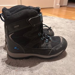 Ett par begagnade svarta vinterkängor. De har en praktisk kardborreknäppning och snörning för bra passform. Perfekt för lek och bus i vintervädret.