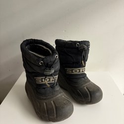 Ett par svarta vinterkängor med varmt foder. Kängorna har kardborreband och elastiska snören för enkel justering. Sulan är robust och ger bra grepp. Observera slitage vid upptill på skon (se bild 4).