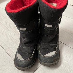 Ett par begagnade svarta vinterkängor. De har en praktisk kardborreknäppning och snörning för bra passform. Perfekt för lek och bus i vintervädret.