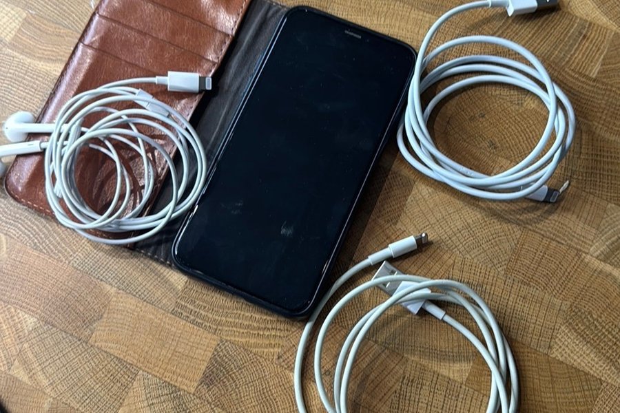 iPhone X med 64 GB lagringsutrymme. Telefonen är svart och kommer med ett brunt fodral. Laddningskablar och hörlurar medföljer.
