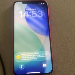 Säljer en iPhone 12. Telefonen har en vit baksida och dubbla kameror. Skärmen är svart.