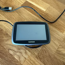 TomTom GPS-navigator för bil. Enheten har en tydlig skärm som visar kartor och navigeringsinstruktioner. Den är utrustad med en sugkoppsfäste för enkel montering i fordonet och en strömkabel för anslutning till bilens 12V-uttag.