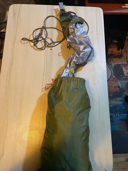 Tarp i packpåse med upphängnings lina i pracord med carbinhakar redo att användas