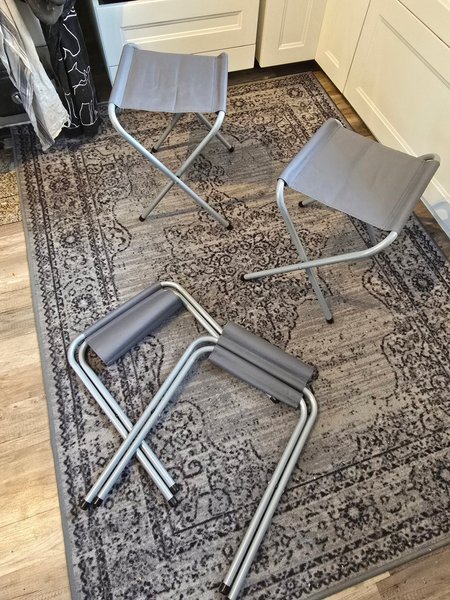 Fällbara pallar i grått tyg och metallram. Lätta att transportera och förvara.