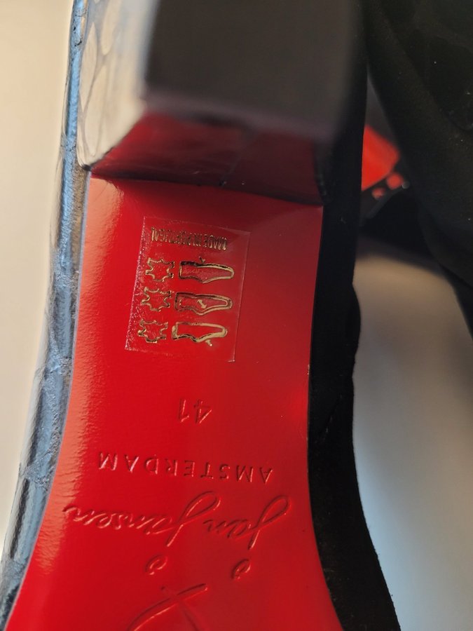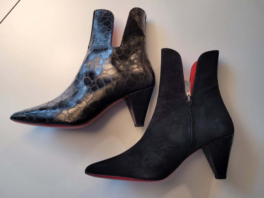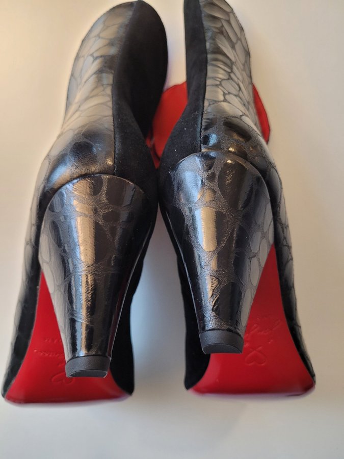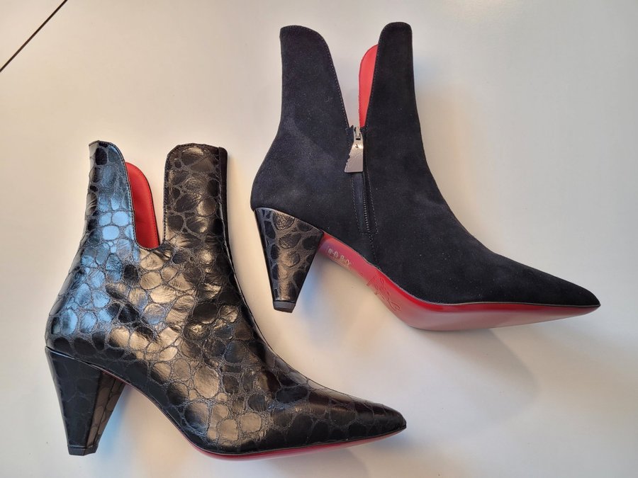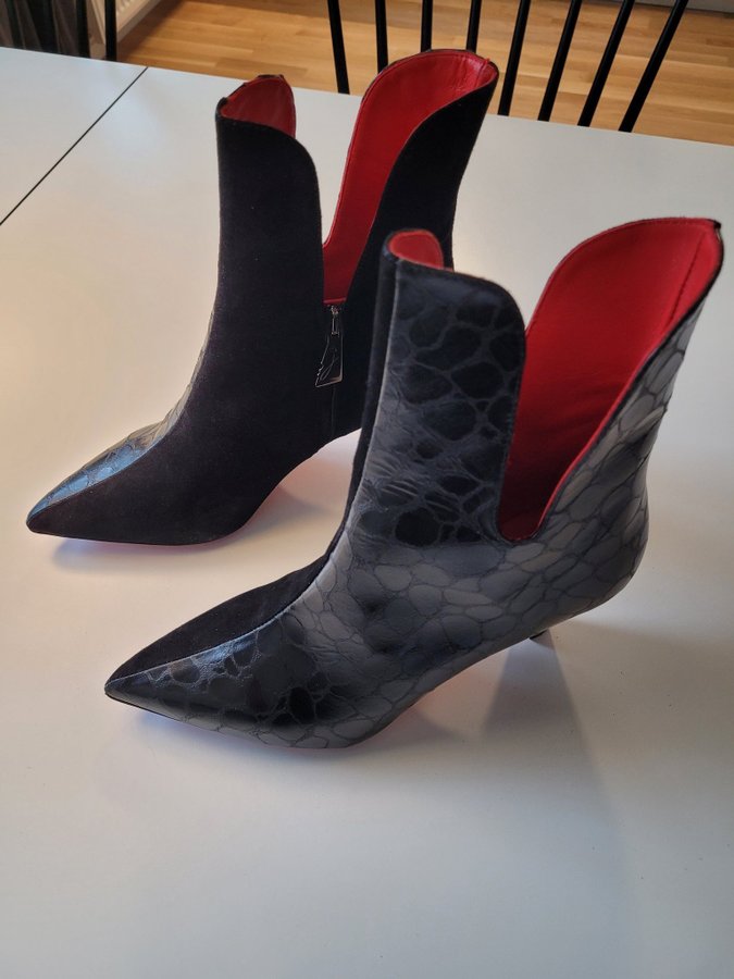 Stövlarna har en unik design med en kombination av olika texturer och en distinkt röd sula.