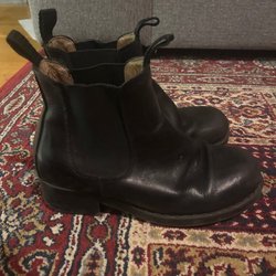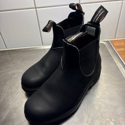 Ett par svarta boots med resår i sidorna och grov sula.