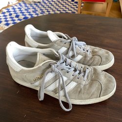 Ett par klassiska Adidas Gazelle sneakers. Skorna har en tidlös design med de ikoniska ränderna på sidan och en bekväm passform. Perfekt för en avslappnad och stilfull look.