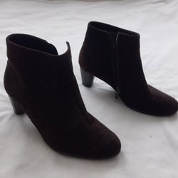 Ett par bruna ankelboots med dragkedja på sidan och en klack.