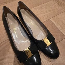 Ett par svarta ballerinaskor med en dekorativ rosett. Skorna har en låg klack.