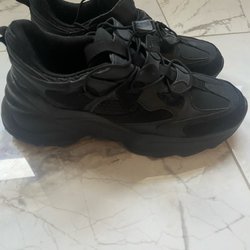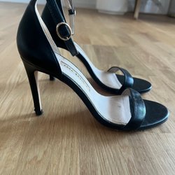 Eleganta svarta mules med en öppen tå och en bekväm slip-on design. Skorna har en bred rem över foten och en diskret klack, vilket gör dem lämpliga för både vardag och fest. Storlek står 41 fat passar 39-40
