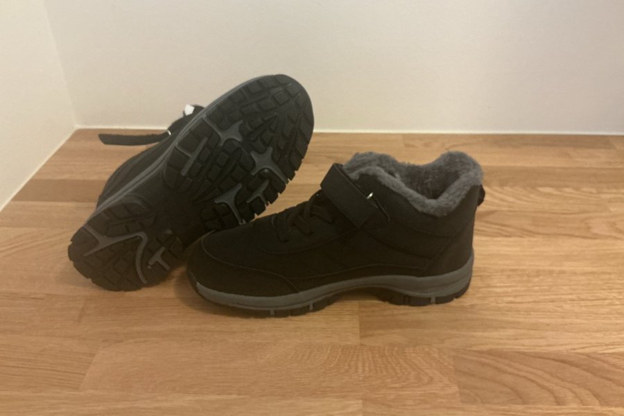 Ett par svarta vinterkängor med grått foder. Kängorna har en robust sula och kardborreknäppning för enkel justering. Det finns 3 par, alla är helt nya.