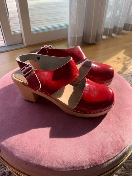 Ett par röda träskor med justerbar rem. Fint skick. Svensktillverkade i läder