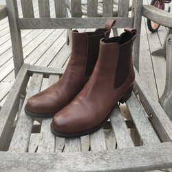 Ett par bruna boots med resårpaneler på sidorna och en dragflik baktill för enkel påtagning. Skorna har en låg klack och en rundad tå.