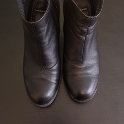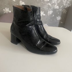 Ett par svarta stövletter med fyrkantig tå och blockklack. Stövlarna har en dragkedja på insidan för enkel på- och avtagning. De är designade för att sitta åt runt ankeln.
