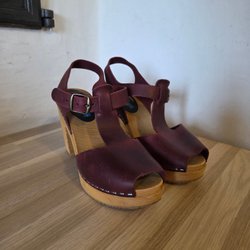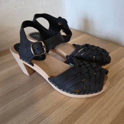 Moheda träskor med öppen tå och ankelrem. Träbotten med nitar längs kanten. Klackhöjd på cirka 7 cm.