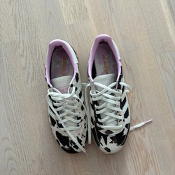 Ett par vita Adidas sneakers. Perfekt för vardagsbruk. Skorna har snörning och en sportig design med Adidas-loggan på sidan. Innersulan är rosa och detaljer i rött.