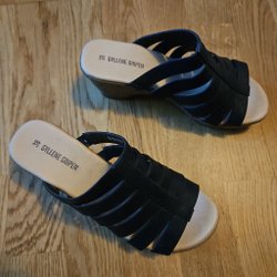 Ett par svarta tofflor med dekorativa nitar och vita sömmar. Skorna har en öppen tå och en bekväm sula. Innermått 24 cm.