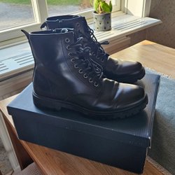 Ett par svarta huggar kängor i skin med snörning och med stålhätta. Storlek 39 Inport från USA Skorna har en robust sula och är i nyskick.