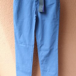 Ett par blå jeans med lappar i olika nyanser av blått. Jeansen har en knapp med texten "Never Denim".