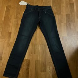 Ljusa jeans med hög midja och vida ben. Jeansen har en klassisk femficksmodell och stängs med knappar. Har klippt av midjan. Hittar ej storlek men jag är 162cm.