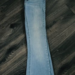 Ett par ljusblå jeans med utsvängda ben. Jeansen har fickor fram och bak.