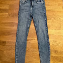 Ett par ljusblå jeans med hög midja och raka ben. Klassisk femficksmodell.
