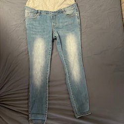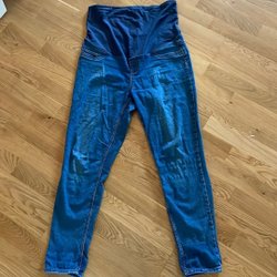 Mörkblå jeans med slitna detaljer och rå kant nedtill. Endast använda ca 10ggr
