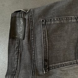 Ett par jeans med fem fickor, gylf med dragkedja och knappstängning. Jeansen har bälteshällor.